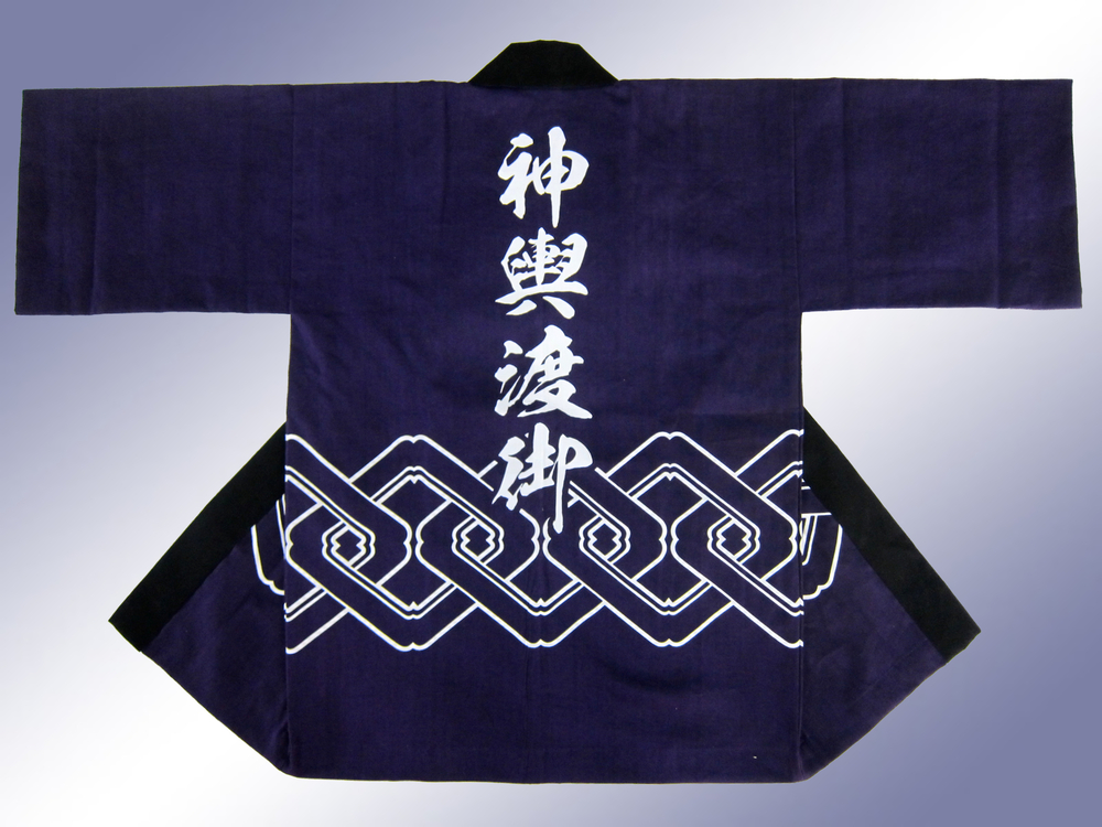 地色は紫ベースにて、陰柄の大きめの吉原つなぎに被(かぶ)せ文字で「神輿渡御」の文字を勢いのある書体でデザインいたしました。シンプルですが飽きのこないデザインと配色ですね。