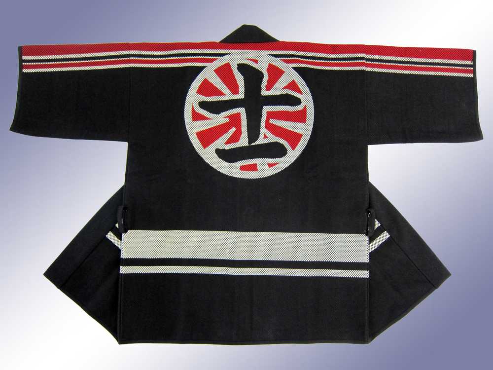 よく見ると一般的な消防半天に比べると背紋もダイナミックに大きめに、赤と白のラインの太さにもオリジナリティが伺えますね~。