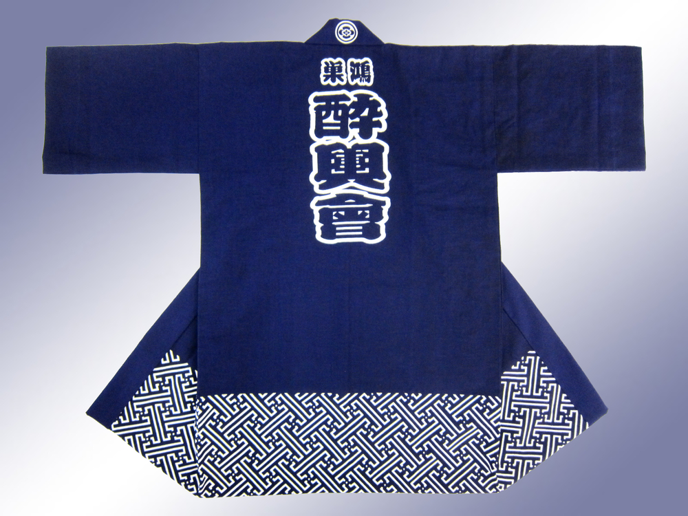 半纏のサイズはそれぞれの体型に合わせてフルオーダーいたしました。また襟首の部分には皆さんの「家紋」を白抜きしてあります!