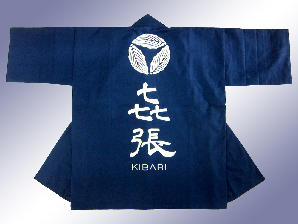 生地は発色の良いシャークスキン生地(綿)を使用、背中はお店の屋号とロゴマークを白抜きにし、地色と同色にした両衿には店名を同じく白抜きとさせていただきました。