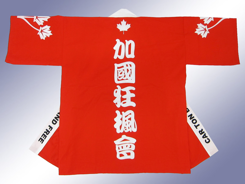 法被を見てわかるようにカナダの国旗をモチーフに作成し、両袖に楓をレイアウトし赤と白の存在感あふれるオリジナル法被の完成です。