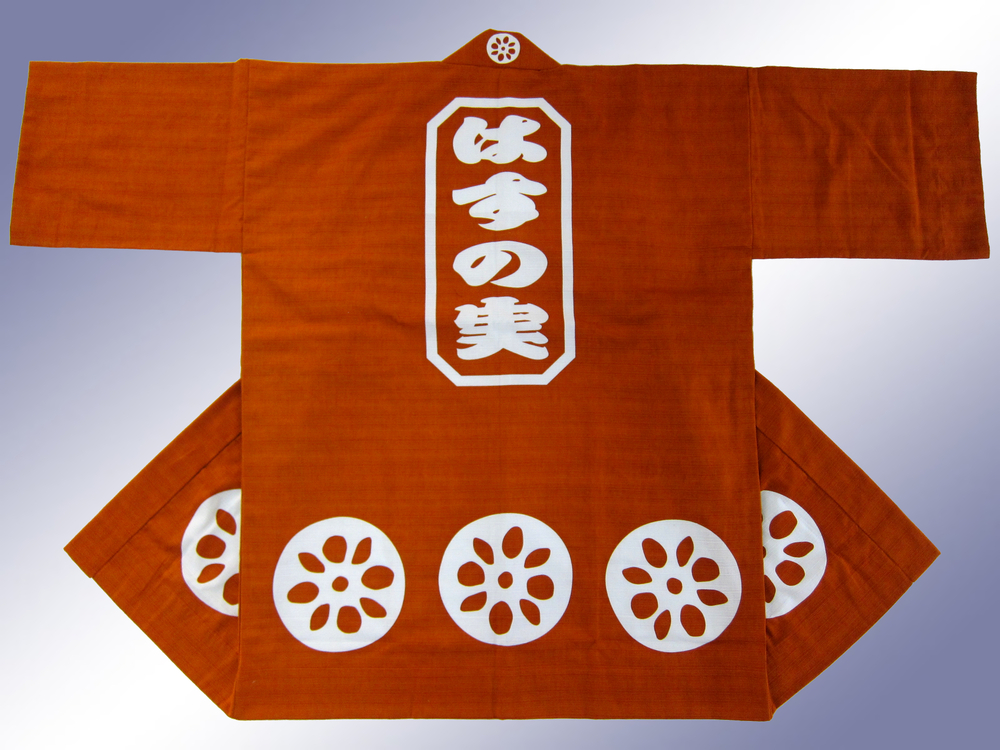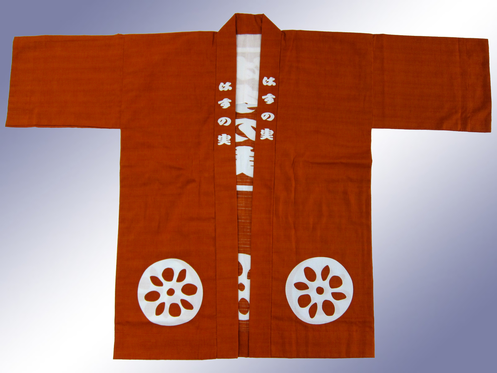 橙色に本染め、店名と腰柄の蓮根を白抜きした完全オーダーメイド法被です。