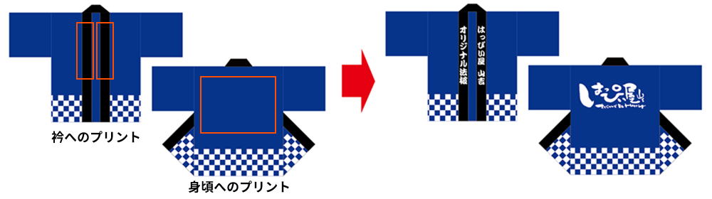 「法被・祭用品を探す」にある既製法被の衿や背中、胸部分などに文字やロゴをプリントします。
