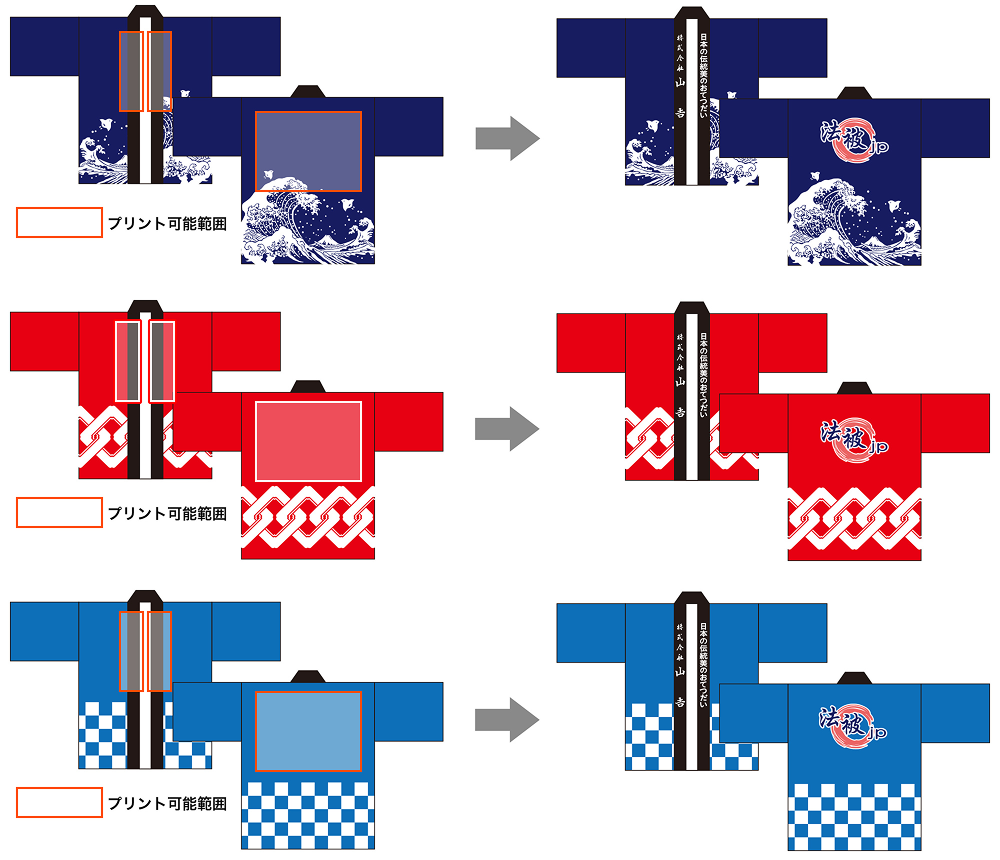 既製品法被へのプリントが出来る範囲